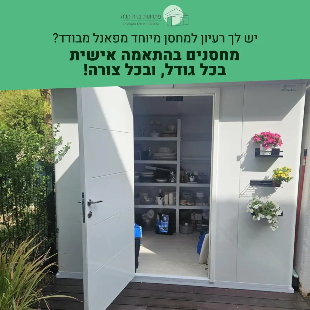לחצר מכל גודל, עמיד ומאורגן. תוסיפו מדפים מובנים ותאורה נעימה לקבלת חוויית שימוש קלה ונקייה.